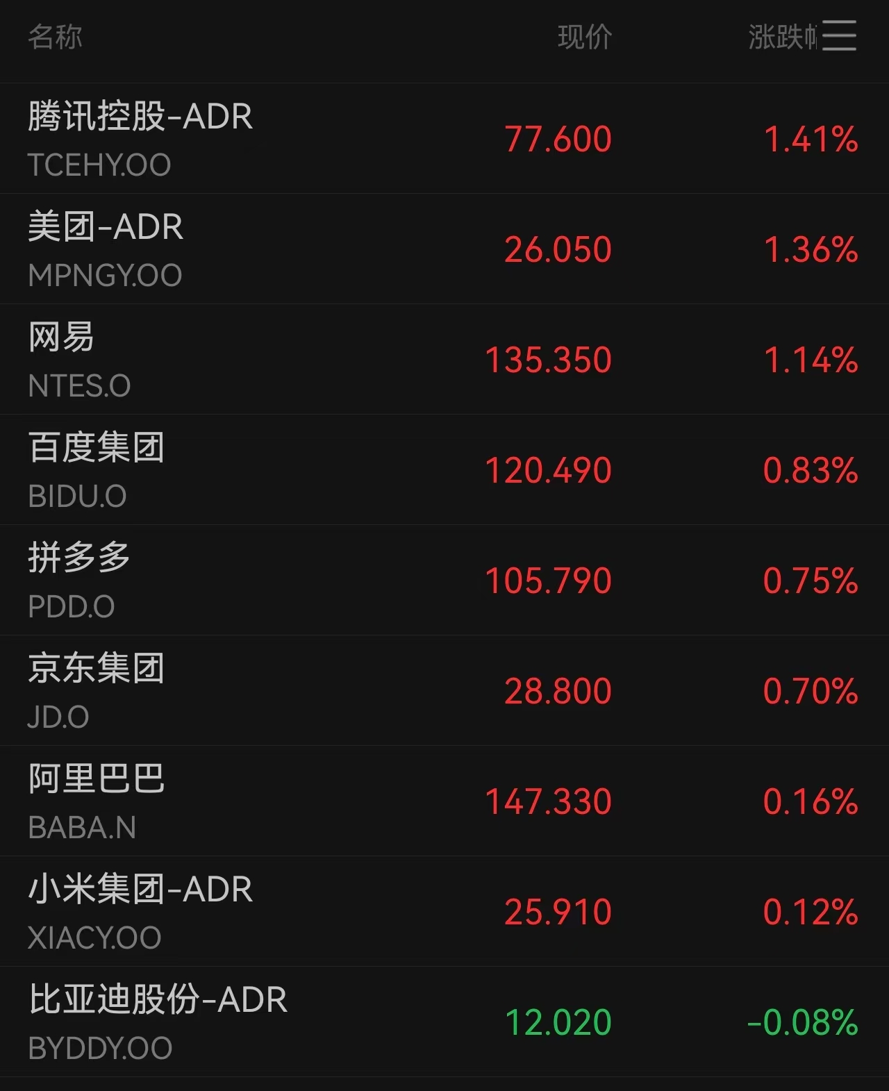 中概股多数上涨,纳斯达克中国金龙指数上涨0.97%。个股方面,小鹏汽车上涨2.82%,富途控股上涨2.19%,百度上涨0.83%,拼多多上涨0.75%,京东上涨0.70%,阿里巴巴上涨0.16%。部分教育及科技股涨幅居前,但有道涨近6%,BOSS直聘涨超5%;下跌个股中,叮咚买菜跌超7%,名创优品跌超2%。