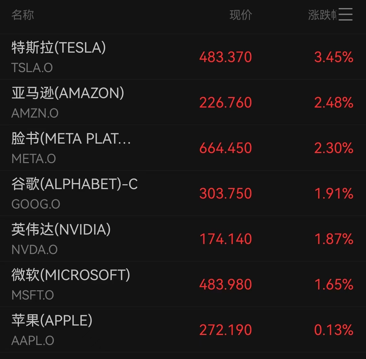 截至收盘,道琼斯工业平均指数上涨65.88点,涨幅0.14%,报47951.85点;标普500指数上涨53.33点,涨幅0.79%,报6774.76点;纳斯达克综合指数表现尤为亮眼,上涨313.04点,涨幅1.38%,报23006.36点,结束此前连续回调的走势。小盘股同步走强,罗素2000指数上涨0.62%。