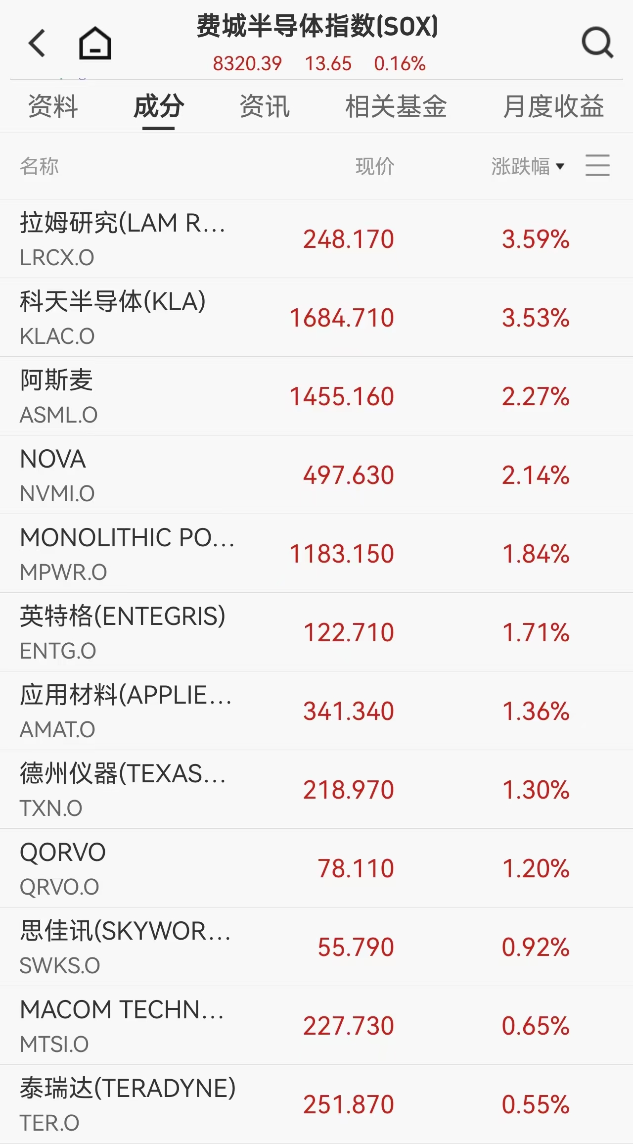 费城半导体指数小幅收涨0.16%,续创历史新高。其中,泛林集团涨逾3.5%,科磊涨约3.5%,阿斯麦涨逾2%,并重新成为欧洲市值最高的上市公司,反映出设备商在晶圆厂扩产和先进制程推进中的持续受益。