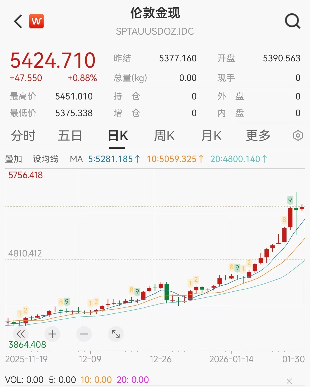 早前避险情绪叠加美元走弱,一度将金价推高至每盎司5500美元上方甚至更高的水平,短期涨幅显著。获利盘集中了结,导致盘中出现“踩踏式”回调。随后,部分逢低买盘和长期配置资金介入,价格迅速回升。整体来看,金价本月累计涨幅仍约24%,处于历史高位区间。